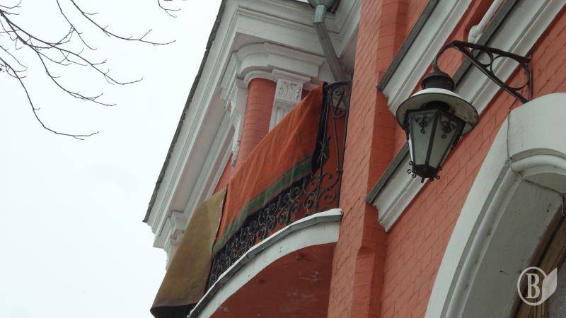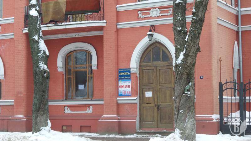Коли підходиш до приміщення Чернігівської "Просвіти", то здається, що там генеральне прибирання - вивішені доріжки, з яких стікає вода і капає на тротуар по вулиці Хлібопекарській, 10 (колишня назва - імені Воровського).