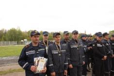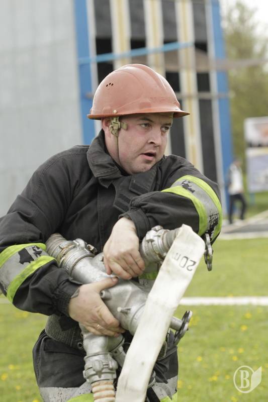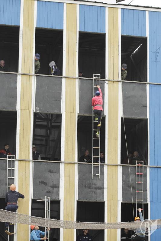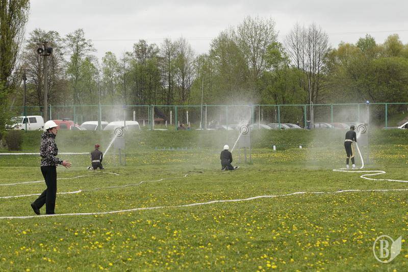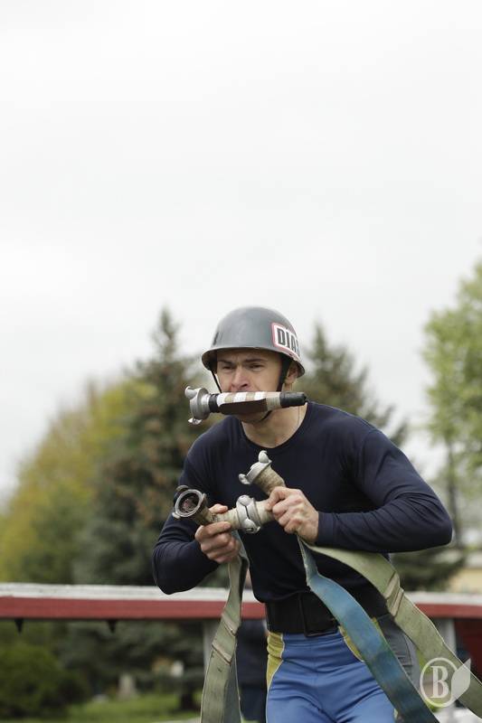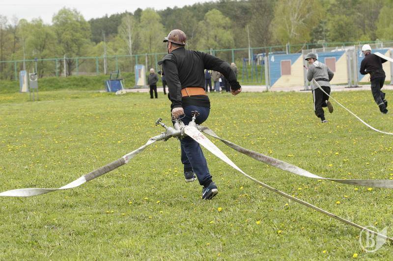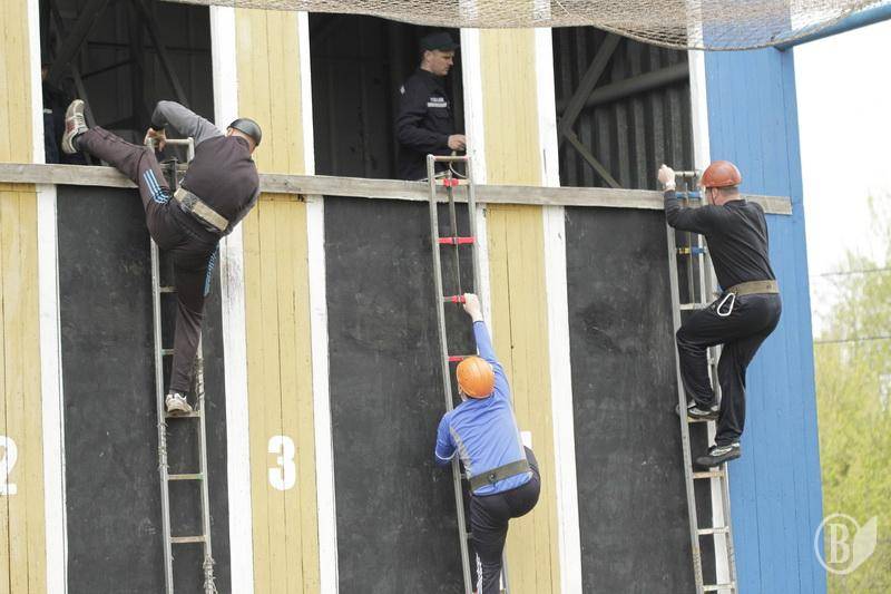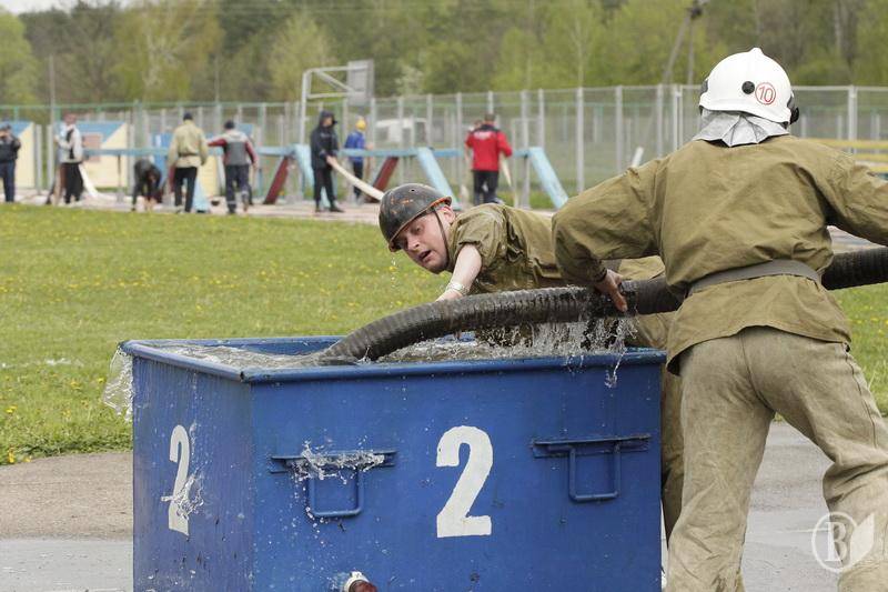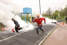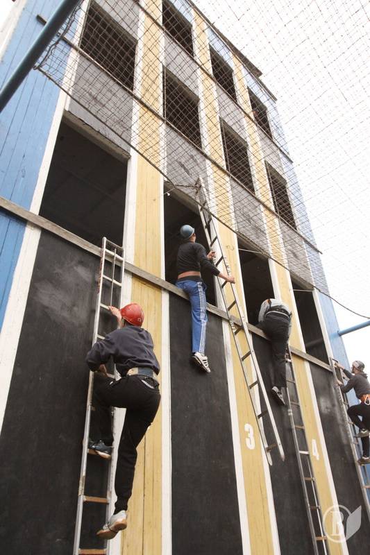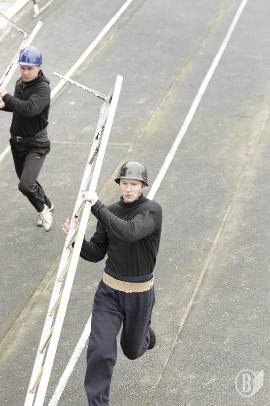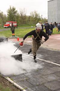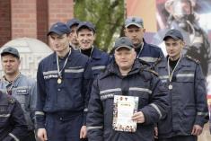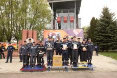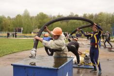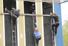 Спасатели соревновались в трех видах: подъеме по штурмовой лестнице в окно 4-го этажа учебной башни, пожарной эстафете 4х100 и боевом развертывании.