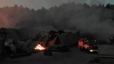 Охранник предприятия около 16:00 заметил загорание в одном из металлических ангаров. Попытки мужчины затушить пожар огнетушителем результатов не дали, ведь огонь по утеплителю из легковоспламеняющегося пенополистирола быстро распространялся по конструкциям здания.