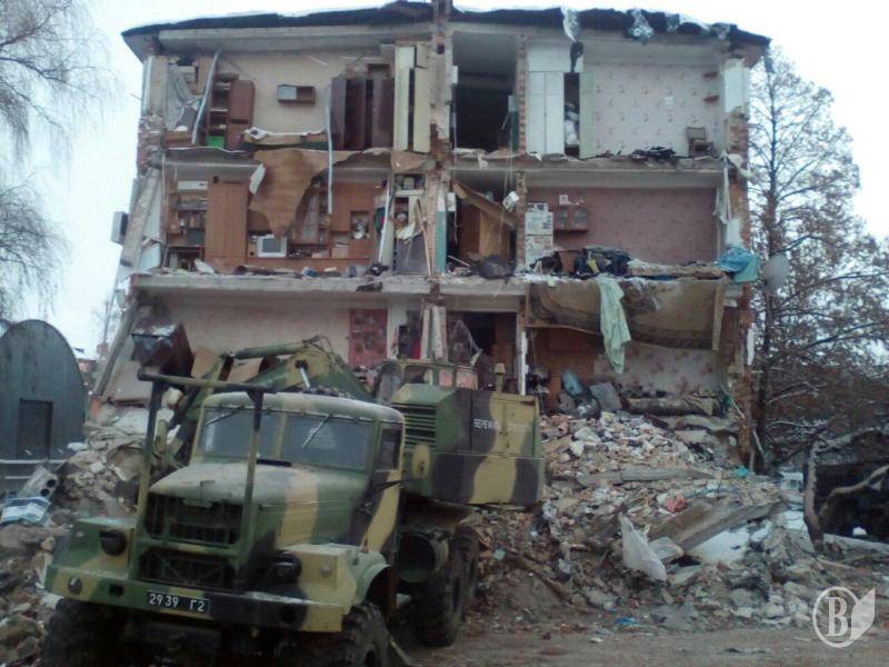 - врешті-решт, чи потрібно бути експертом-вибухотехніком, щоб запитати: чому провалені перекриття до самої землі, якщо вибух був начебто в кімнаті самого верхнього поверху? І це в будівлі навіть без горища чи «технічного» поверху. Що, вибух якійсь спрямованої дії вниз?