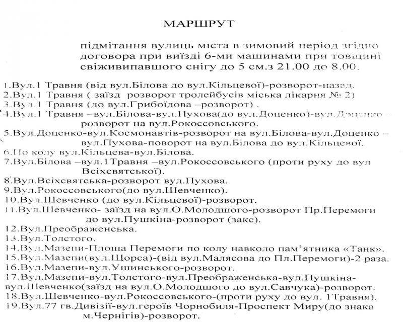 Маршрути денної і нічної змін здебільшого не повторюються – тобто деякі дороги і райони міста розчищаються вдень, а деякі вночі. Вночі це центр і основні транспортні магістралі. Удень – інші райони.