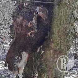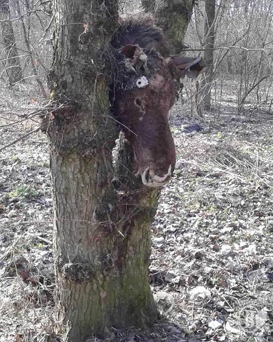 Голова – чи то лося, чи то коня. Вона затиснена у розвилці стовбура.