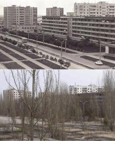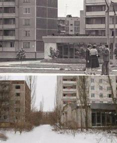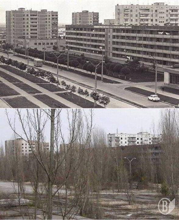 Зміни одних і тих же місць на фото з прогресивного радянського міста Прип’ять до чорнобильської катастрофи та за три десятки років по тому.