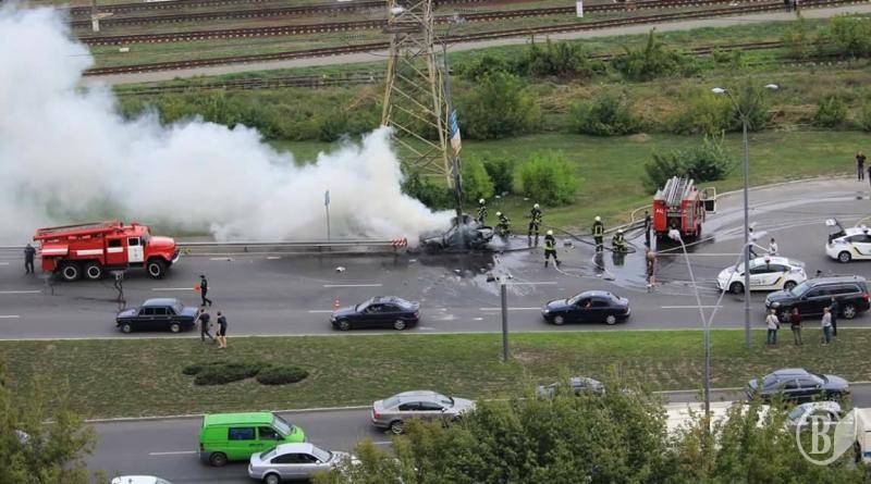 У Києві на Саперно-Слобідській 4 вересня сталося зіткнення двох легковиків. після чого одне з авто вдарилося у стовп і загорілося з подальшим вибухом.
