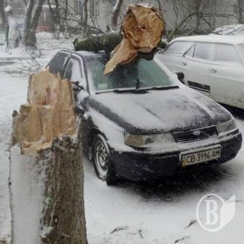 Сьогодні, 18 грудня, дерево впало і пошкодило легковик ВАЗ В Чернігові у дворі будинку на проспекті Миру, 55.