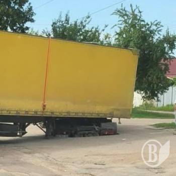 На вулиці Глібова в Чернігові тягач з напівпричепом провалився під асфальт своїми ведучими осями ледве не по саму раму.