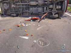За попередньою інформацією, під час виконання маневру обгону жінка-водій не впоралася з керуванням, автомобіль зачепив бордюр (відбійник?) та ліг на бік.
