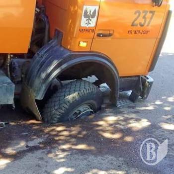 Спецавто з обладнанням для прибирання вулиць комунального підприємства АТП-2528 провалилося крізь асфальт на вулиці академіка Павлова в Чернігові.