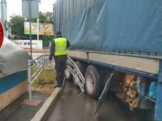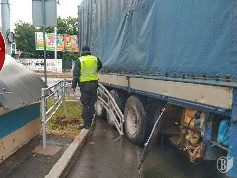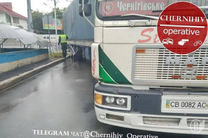 У Чернігові фура зламала паркан на перехресті під час правого повороту вулиці Козацька на проспект Миру.