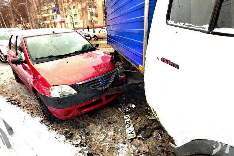 Сьогодні, 2 грудня в Чернігові на заокругленні вул. Івана Мазепи сталося зіткнення трьох авто: легковиків Mitsubishi та Dacia і «ГАЗелі» з будкою.