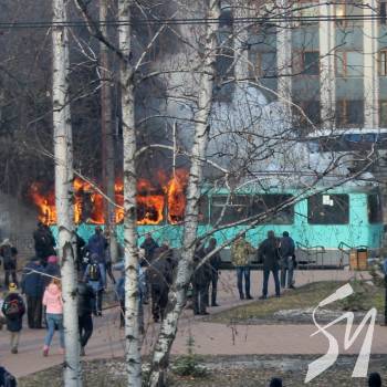 Полум'я охопило передню половину тролейбуса. Тож очевидно, там мало що вціліє.