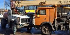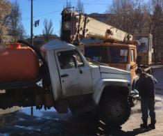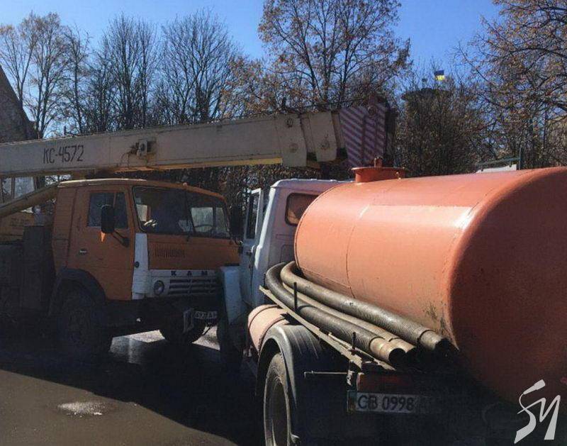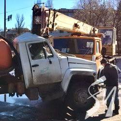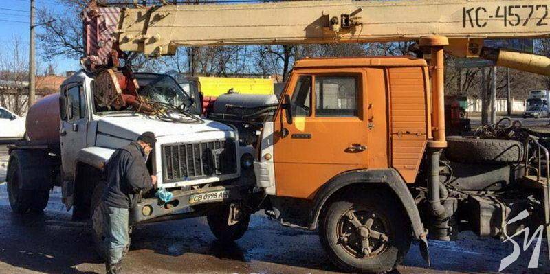 У Чернігові на вул. Івана Мазепи 12 березня автокран КС-4572 на шасі вантажівки «КамАЗ» розбив своєю стрілою з гаком кабіну лайновоза на шасі «ГАЗ» із держномером СВ0998АН.