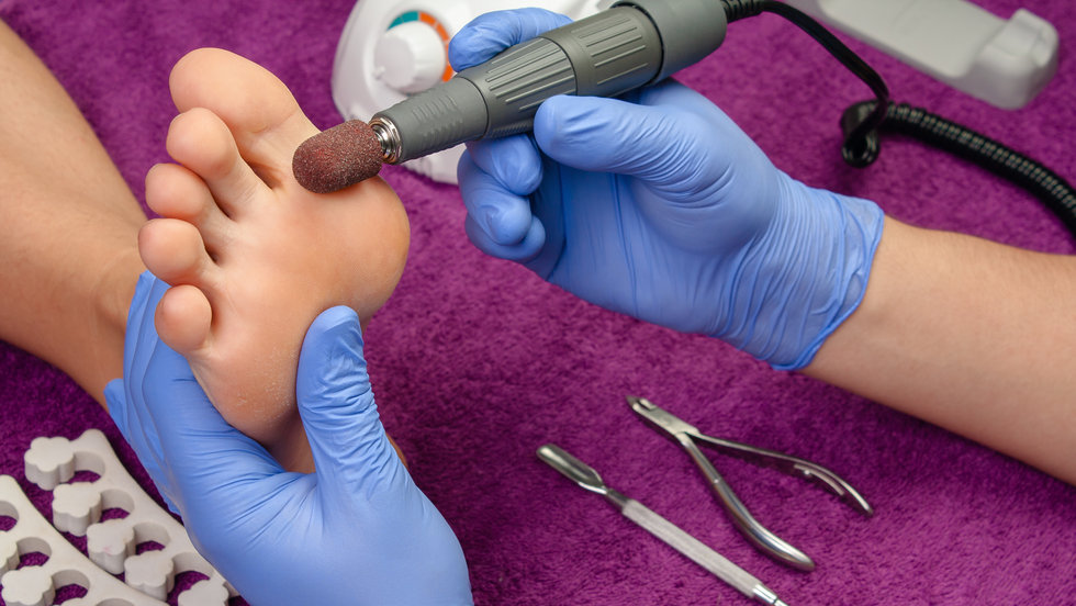 - После начинается работа с огрубевшей кожей. Мастер может использовать сразу аппаратные насадки, специальные пилочки или кислотные средства.