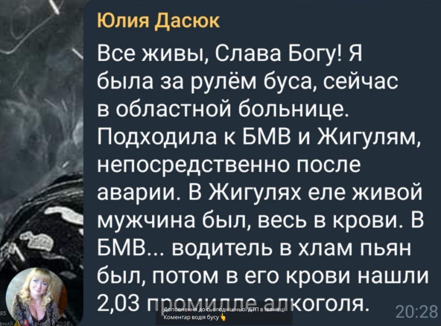 За словами водійки буса, яка у ДТП отримала травми і зараз перебуває в обласній лікарні, всі живі. Значно постраждав водій «Жигулів».