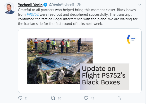 "Вдячний всім партнерам, які допомогли наблизити цей момент. "Чорні скриньки" рейсу PS752 були успішно зчитані і розшифровані.
