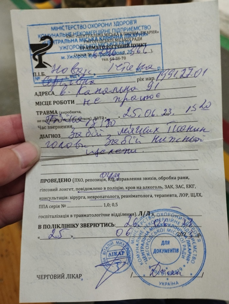 "Ввечері того ж дня в травмпункті Ужгородської міської лікарні в мене зафіксували "забій м'яких тканин голови, забій нижньої щелепи".