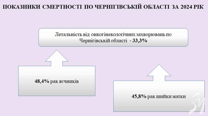 Летальність теж вражає: в середньому по країні від цих захворювань помирає 29,8% жінок, а по Чернігівській області цей показник ще вищий – 33,3%. Особливо небезпечною є ситуація з раком яєчників (48,4% летальності) та раком шийки матки (45,8%).