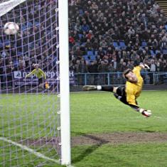 На фото – момент перед пенальті. Фотограф стоїть за воротарем, так що можна побачити обидві команди і табло з рахунком. Гравець-суперник схилився над м’ячем і ніби хрестить його, воротар напружений. Стадіон завмер.