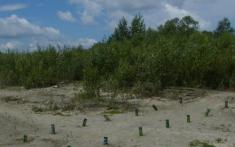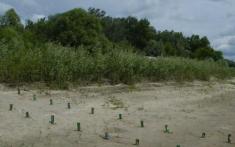 Прокидаються два рибалки на березі. Навкруги земля перекопана і сітті стоять.
