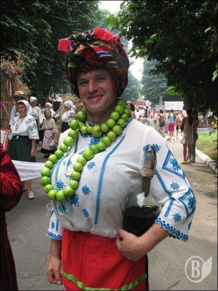 — Угощайтесь, это же своя, сладкая! — зазывает пышногрудая молодая женщина с длинным ожерельем из зеленых яблок на шее.