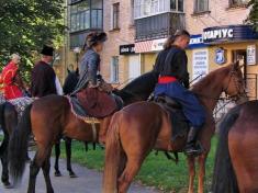 У місті Євгенія не важко впізнати, бо, хоча сам родом з Абхазії, на вигляд він – типовий український козак: чорні вуса, оселедець, атлетична статура. Шашка, кінь, червоний одяг – його атрибути, коли разом з представниками чернігівського козацтва (того самого, якому передано Катерининську церкву) Євгеній бере участь у показових виступах на день міста чи інші свята.