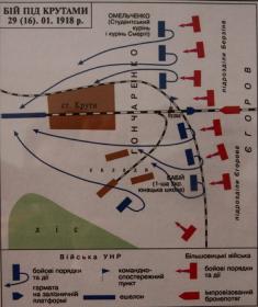 В частности, на выставке представлена схема боя под Крутами, списки установленных участников неравного боя, их фотографии, фотографии похорон погибших, которые состоялись 19 марта 1918 года на Аскольдовой могиле в Киеве.