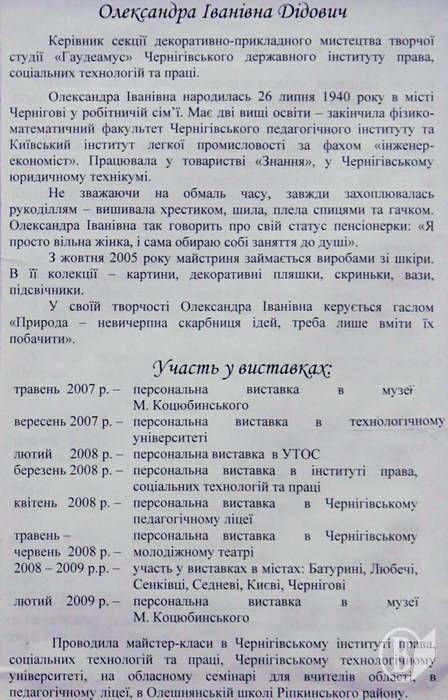 А.Дидович родилась в Чернигове, получила два высших образования. Творить стала в октябре 2005г. С тех пор занимается оформлением разных изделий из кожи.