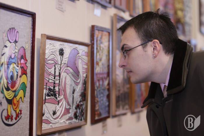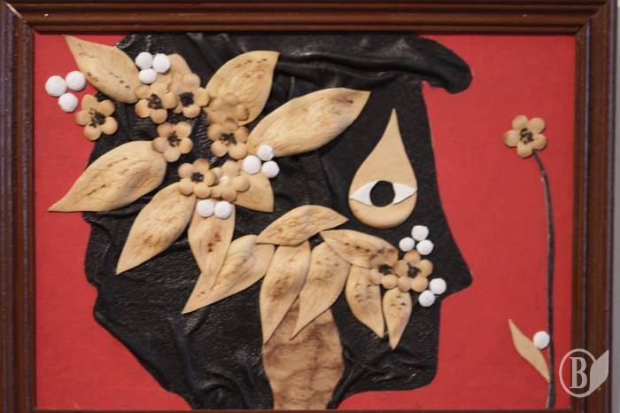 На выставке представлены картине из кожи, выработанные А.Дидович и картины и творения из дерева Дмитрия Зуганова.