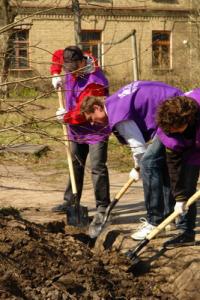 «Кролики» на Ремзаводе, на проспекте Победы, улицах Боевой, Рокосовского и Доценко садили деревья, гребли листья, устанавливали песочницы и просто общались с участниками уборки во дворах.