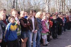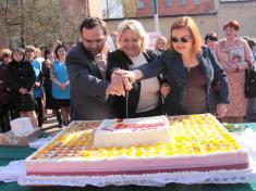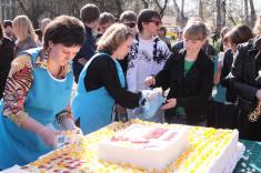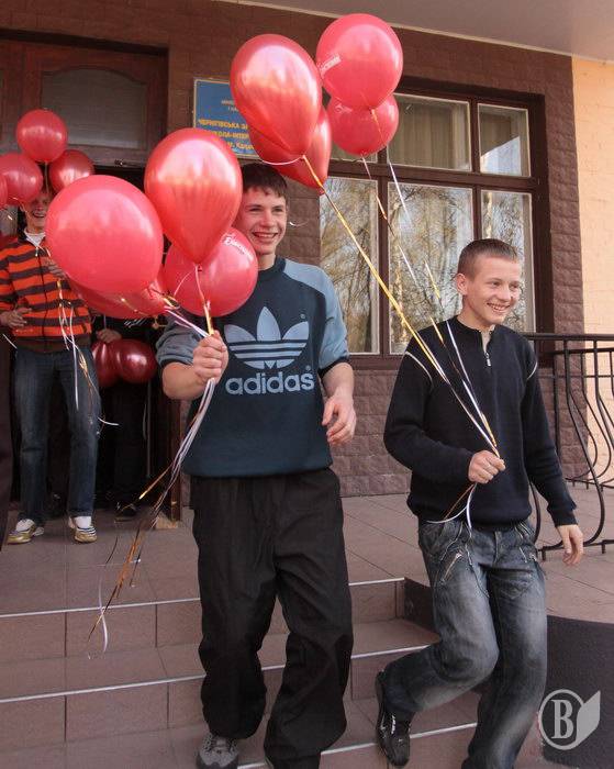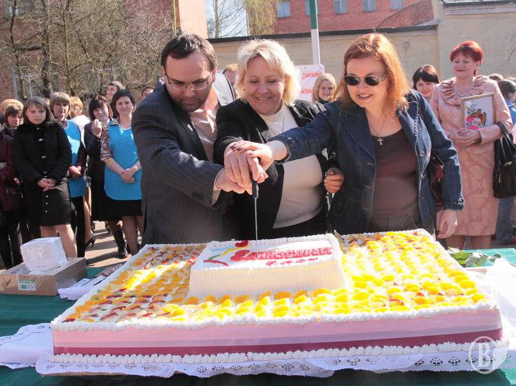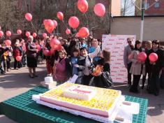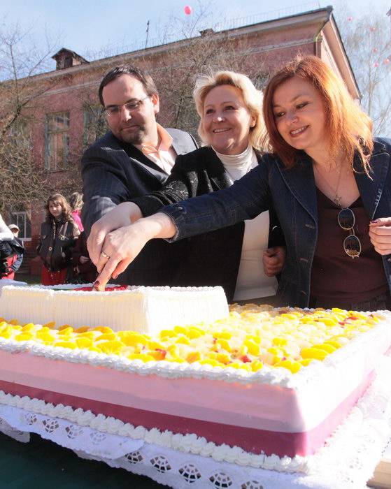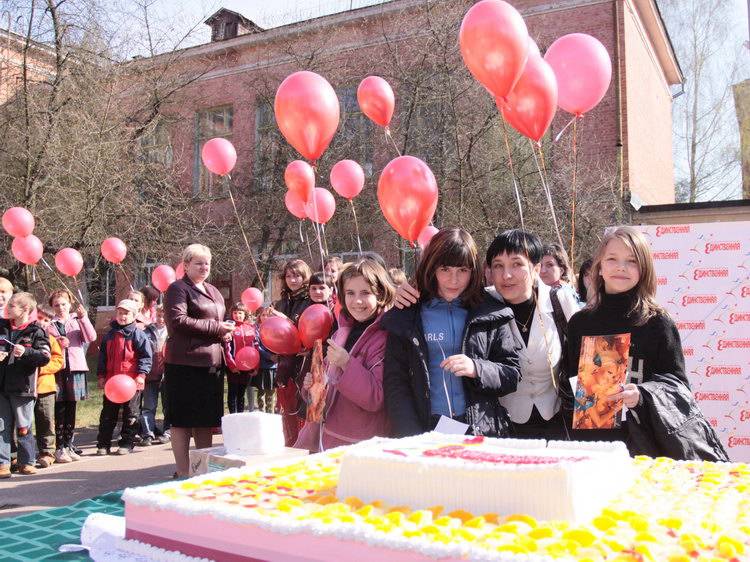 Потом все были приглашены на двор, где их ожидал огромный торт. Дети запускали в воздух надувные шарики «мечты» и пробовали торт.