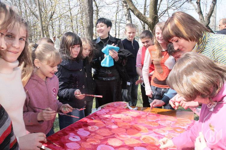 Дальше детей разделили на несколько групп. Куратором каждой группы выступала «звезда» и профессиональный художник-дизайнер. Вместе с детьми они творили «чудеса». Кто рисовал картины, кто создавал современные девичьи сумки, кто разрисовывал керамику.