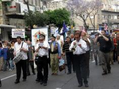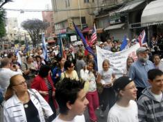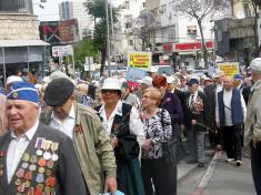 Більше тисячі чоловік йшли по Хайфі під марш "День Перемоги". Над колоною майоріли прапори країн союзників, і, звичайно ж, червоний прапор.