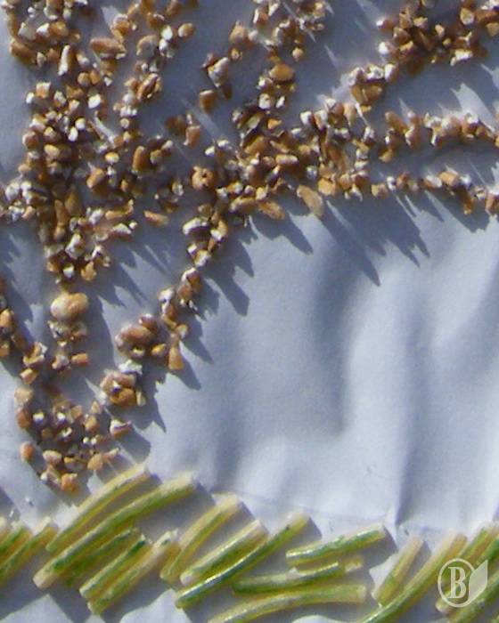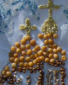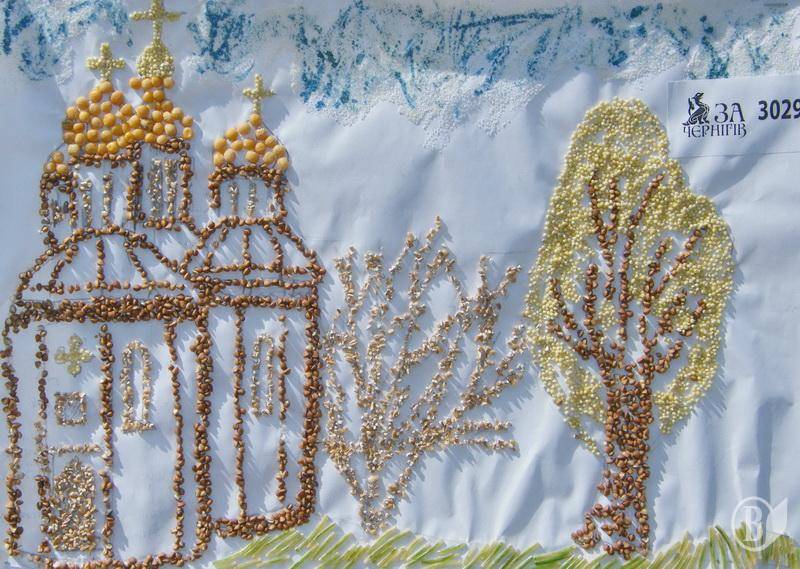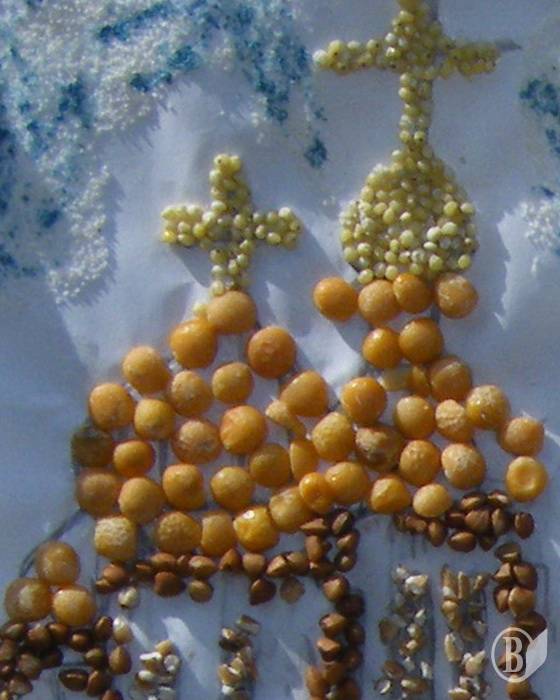 Здесь и гречневая церковь с гороховыми куполами, и пшеничные кусты, и деревья из пшена. Всё это – на травке из вермишели. Не хватает разве что молочных рек с кисельными берегами.