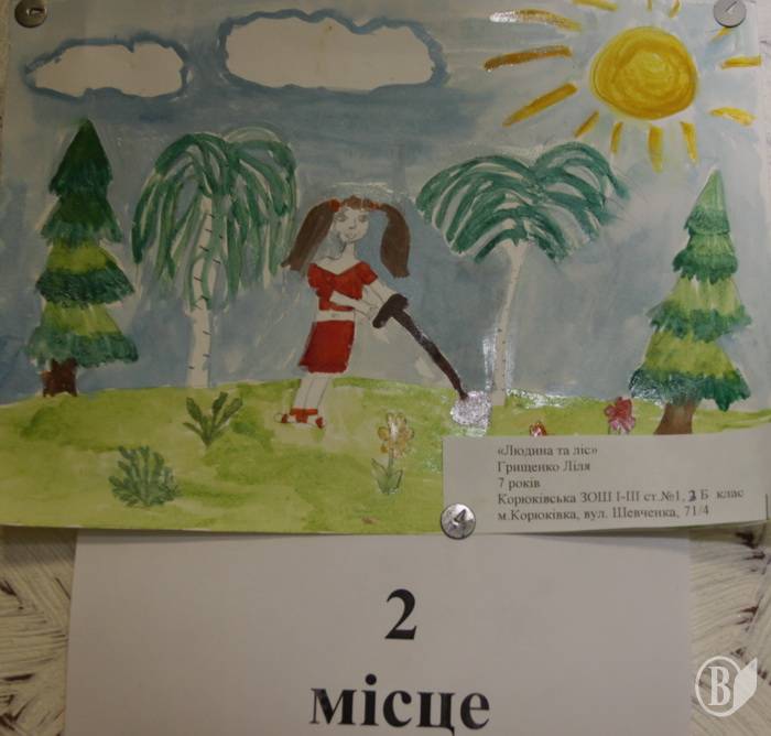 — 2 место -- Грищенко Лиля Андреевна, 7 лет, Корюковская ООШ I-III степеней №1, 3-Б класс, рисунок «Человек и лес»;