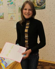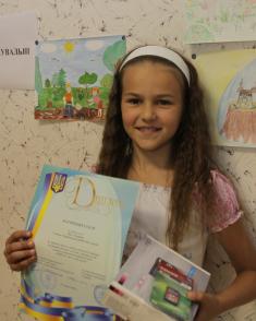 - 1 место -- Кантур Мирослава Юрьевна, 13 лет, Комаровская ООШ I-ІІІ степеней, 6 класс, Борзнянского района, произведение «Будет ли Гилеей наша земля?»;
