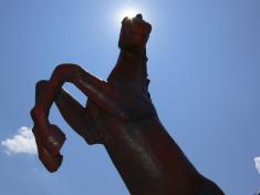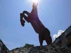 Неизвестные острословы как-то умудрились перекрасить аутентично черного коня под «зебру». Потом коня еще раз покрасили. Уже «официально». Так металлический вороной конь стал гнедым.