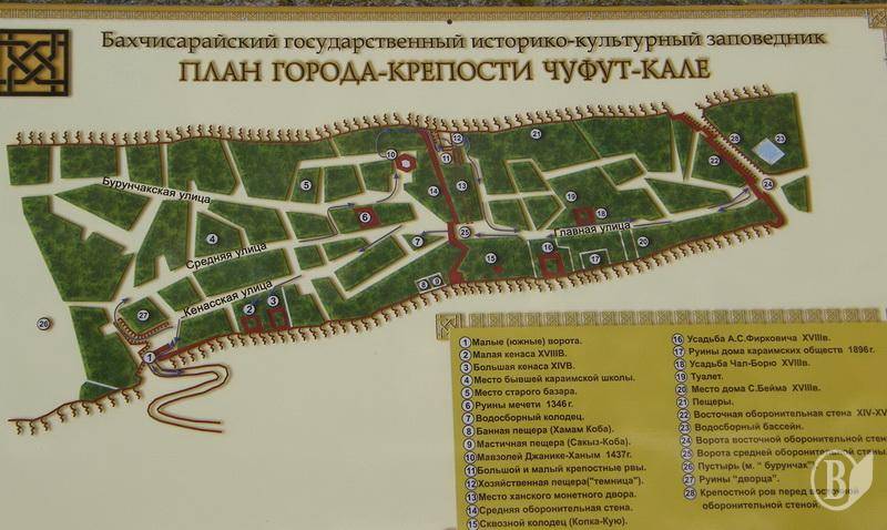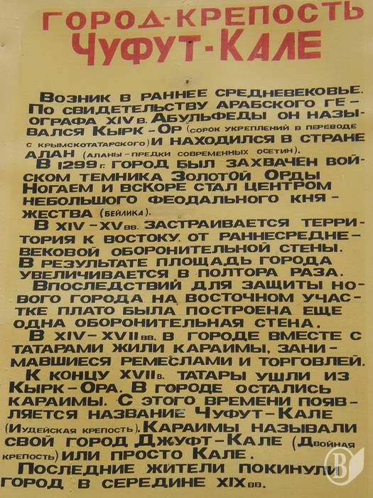 Именно тогда изменяется и название поселения: сначала это просто Кале (крепость, с 1608 г.), а позже - Чуфут-Кале (Иудейская крепость). Еще один вариант названия с XVII столитя - Джевхер-Кермен (крепость драгоценностей) - не прижилось, хотя и вошло в историю благодаря упоминаниям в подорожных описаниях известного путешественника того времени Евлия Челебы.