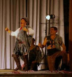 – И за это он сгорает в огне, которым забавляется нечистый. Очень красиво поставлена эта сцена – волны красных тканей, адские герои в красной одежде. Выглядит просто-таки, что Бульба горит по-настоящему. Еще очень интересен сюжет, где гости растягивают огромный рушнык, создавая иллюзию самого настоящего застолья. Поражают и жилистые казачьи торсы в волчьих шкурах, особенно их, как я себе назвала, «Коломыя на плечах». Вы проработали много источников для того, чтобы поставить этот мюзикл.