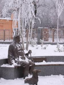 У місті Прилуки, на реконструйованій коштом мецената центральній площі за будь-якої погоди зустрічає перехожих Народний артист Микола Яковенко зі своїм чотириногим другом.