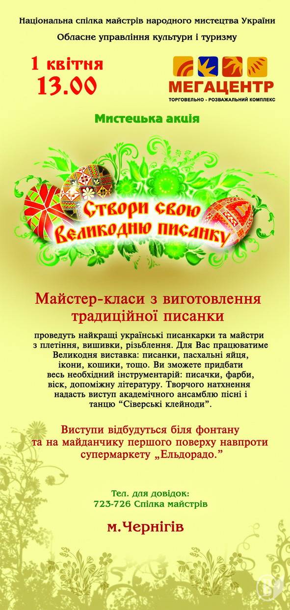 1 апреля в черниговском «Мегацентре» состоится предпраздничная акция: мастер-класс по традиционному писанкарству „Создай свою Пасхальную писанку”.
