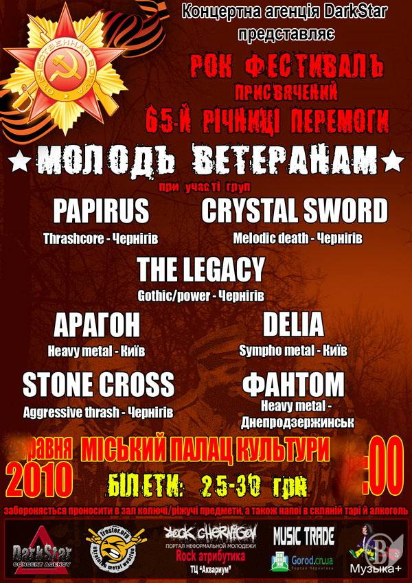 Обычно такие концерты в нашем городе проходят в клубе по улице Павла Тычины. То ли металлисты посчитали престижным организовать концерт в Дворце культуры, то ли были какие-то другие "заинтересованности", но очевиден тот факт, что не имеющая к памяти людей, которые боролись 65 лет назад и верили, что они это делают для лучшего будущего нас с вами, музыка и аудитория имеют место быть, спекулируя праздником Победы.