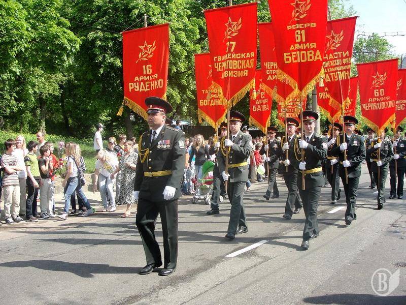 Во время торжественной поступи к Мемориалу Славы офицеры Черниговского областного военного комиссариата пронесли боевые флаги военных частей прославленной 1-й Краснознаменной гвардейской армии, воины которой освобождали Чернигов в годы войны и улицей города проехал бронетранспортер с Красным Флагом на башне и Знаком Победы.