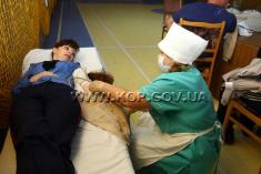 Також не оминули цю благодійну акцію і жінки в погонах. Традиційно прийшла внести свою «краплину крові» начальник відділу інформаційних технологій УМВС, полковник міліції Валентина Акуленко. Ця на вигляд досить тендітна пані завжди здає кров на рівні з чоловіками.