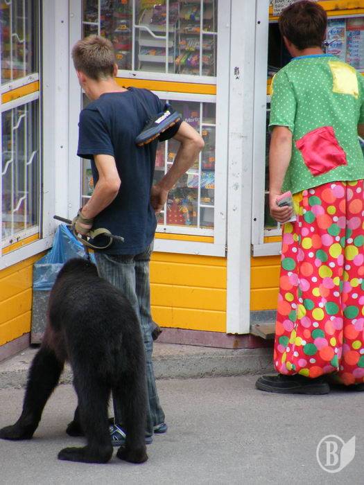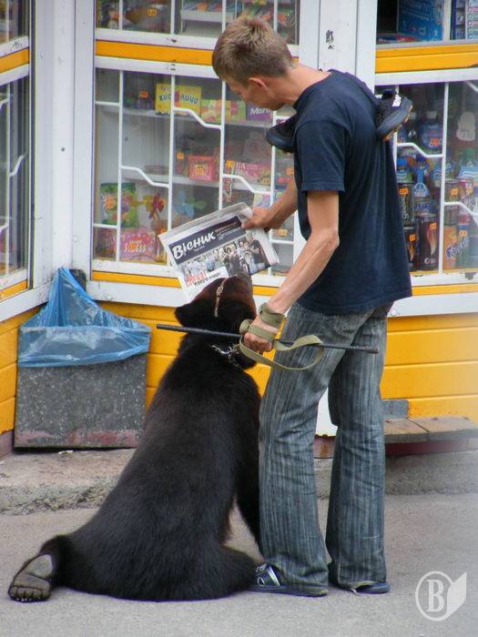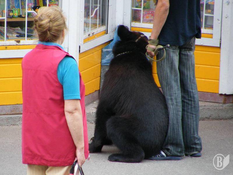 Втім, ведмідь виявився тварюкою достатньо культурною. Він ходив по вулиці, як і належить звірам, у наморднику і з поводком. Не те що переважна більшість псів у нашому місті.