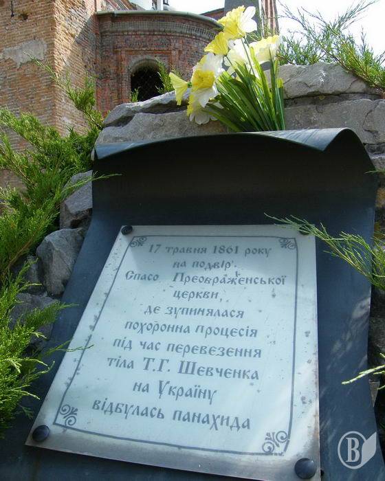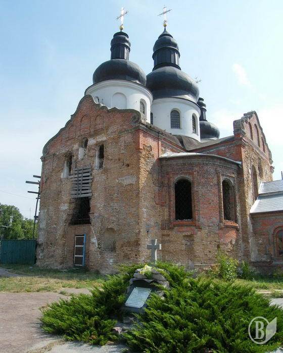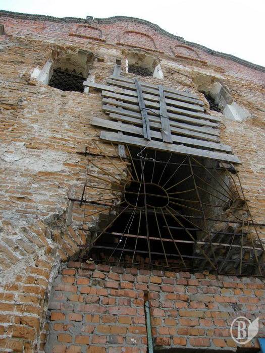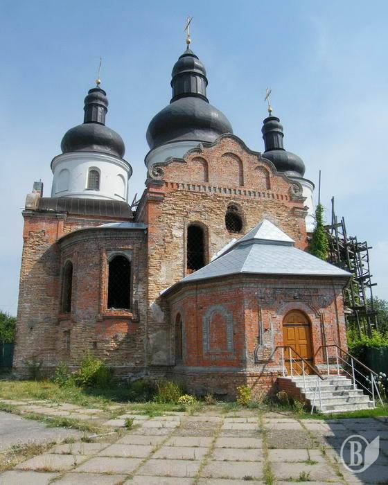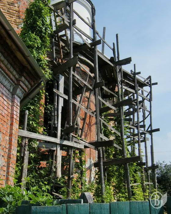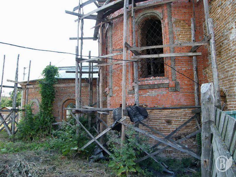 Спасо-преображенська церква у місті Ніжині. Храм стоїть у лісах. Проте вони вже поросли зіллям. Давня кладка, що стояла століттями, доповнена новою, на цементі.