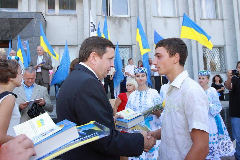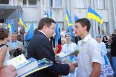 После церемонии поднятия Государственного Флага 26 юношей и девушек получили из рук руководства области и города паспорта граждан Украины.