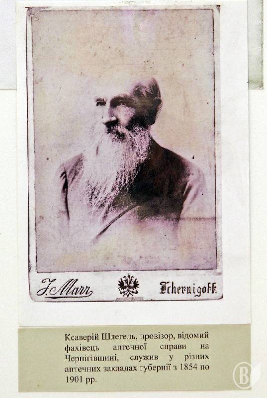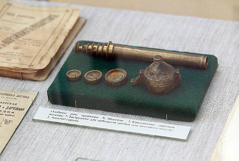 Цікаві документальні матеріали знайомлять з умовами існування аптек, підтвердженням наявності капіталу, необхідного для відкриття вільних (приватних) аптек, послужним списком знаного губернського провізора Шлегеля. Родзинкою виставки є оригінальний аптекарський реманент ХІХ століття.