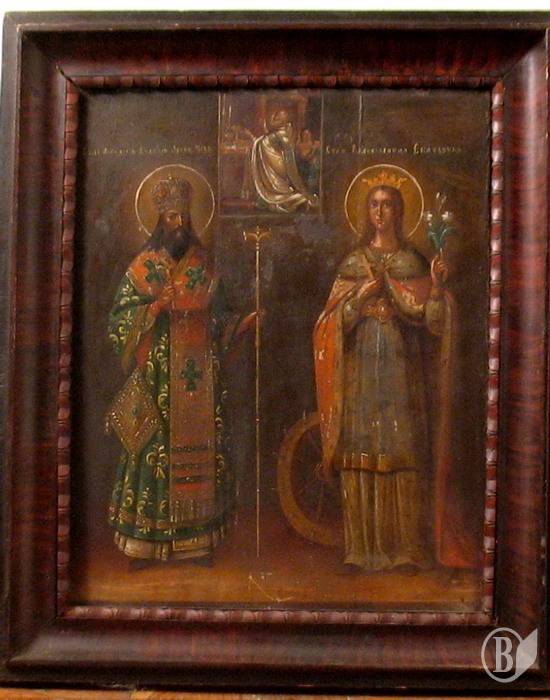 Серед них – ікона «Святитель Феодосій Углицький та Св. Катерина», ХІХ ст. Вона привертає увагу, насамперед, досить рідкісним іконографічним сюжетом. На іконі зображені Святитель Феодосій Углицький та Св. Катерина на повен зріст. Поряд з вликомученицею Катериною – колесо – знаряддя її тортур. У верхній частині ікони – Св. Микола, який молиться перед престолом з чашею для причастя.