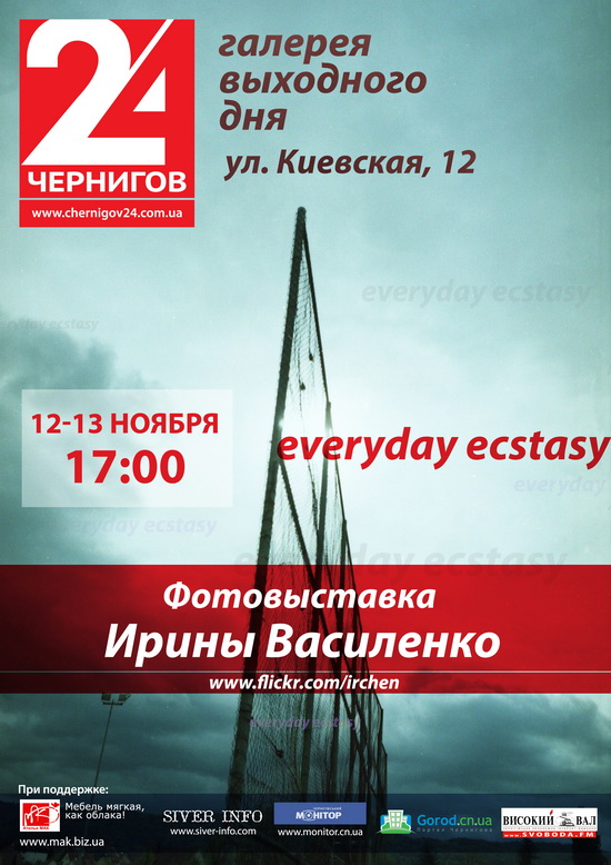 Партнеры Галереи выходного дня Чернигов24 - общественная организация «Черниговская инициативная группа», мебельное ателье «МАК», Сервис пополнения счета Webmoney «PinTorg». Информационная поддержка: городской портал Gorod.cn.ua, справочный портал Чернигова Siver – Info, черниговское независимое интернет- издание «Высокий Вал», информ – агентство «Черниговский Монитор».