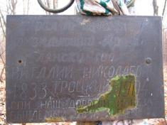 "Як нам повідомила вчителька Волосківської ЗОШ Катерина Анатоліївна Щерба, у 20-30 рр. ХХ ст. родинний склеп Троцьких було знищено і прах генерала потурбували. Поховання були пограбоване і знищене."